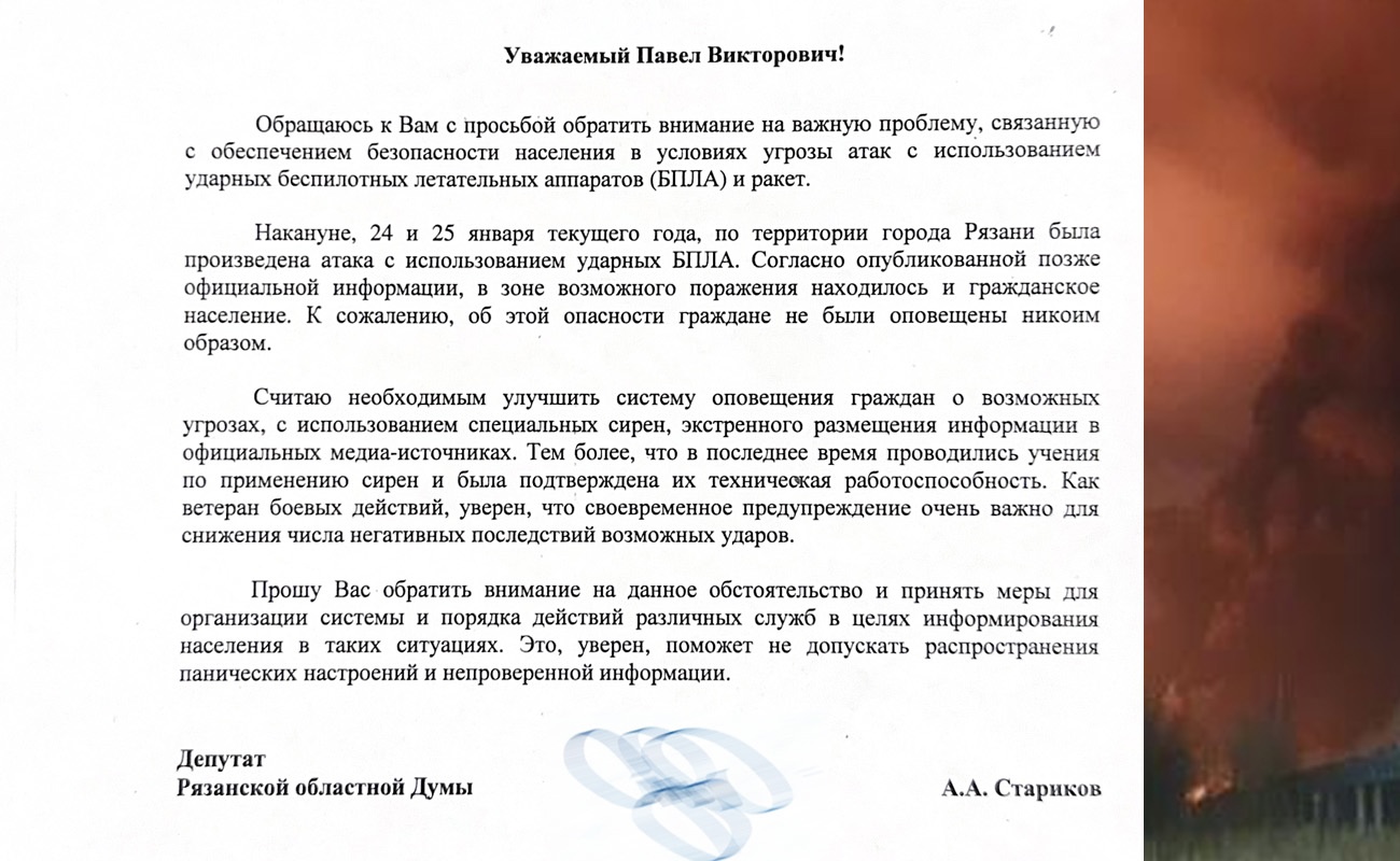 «Во время того, как жители Рязани слышали взрывы в воздухе, то искали информацию в самых разных источниках, кому какие были доступны. В то же время никакого массового оповещения населения не проводилось, в том числе не звучали звуковые оповещения о возможной воздушной тревоге. Как ветеран боевых действий, считаю, что это было бы необходимо. Любая готовность к экстренной ситуации очень важна! Именно поэтому считаю важным и нужным использовать официальные технические системы оповещения», – прокомментировал ситуацию депутат ЛДПР Александр Стариков.