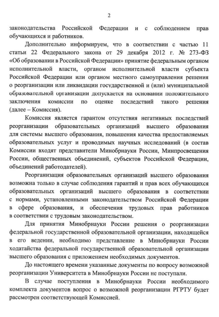 Министерства науки и высшего образования России направило ответ о ситуации с присоединением РГРТУ