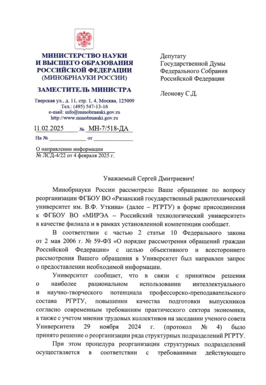 В ответ на запрос депутата фракции ЛДПР Государственной Думы Сергея Леонова поступило сообщение из Министерства науки и высшего образования России. Речь идёт о том, является ли обоснованной информация о том, что предстоит присоединение Рязанского радиотехнического университета к московскому вузу