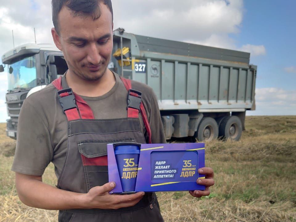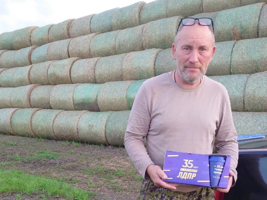 Активист ЛДПР вручил подарки от партии, выражая благодарность за неоценимый вклад сельхозработников.