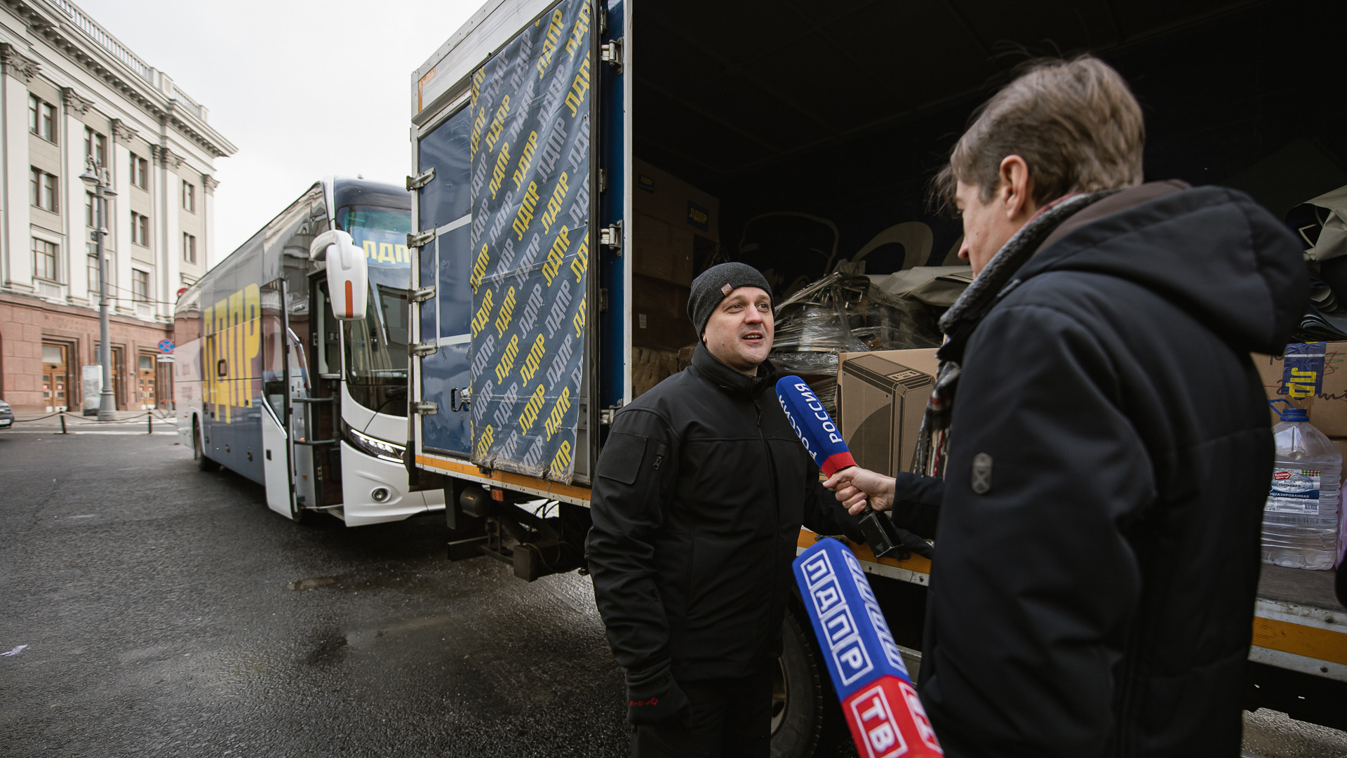 Колонна грузовых автомобилей с 15 тоннами гуманитарной помощи от ЛДПР для бойцов и жителей ДНР, ЛНР, Запорожья и Херсонской области отправилась непосредственно от здания Государственной Думы. Руководитель фракции ЛДПР в Госдуме Леонид Слуцкий дал старт движению автокаравана