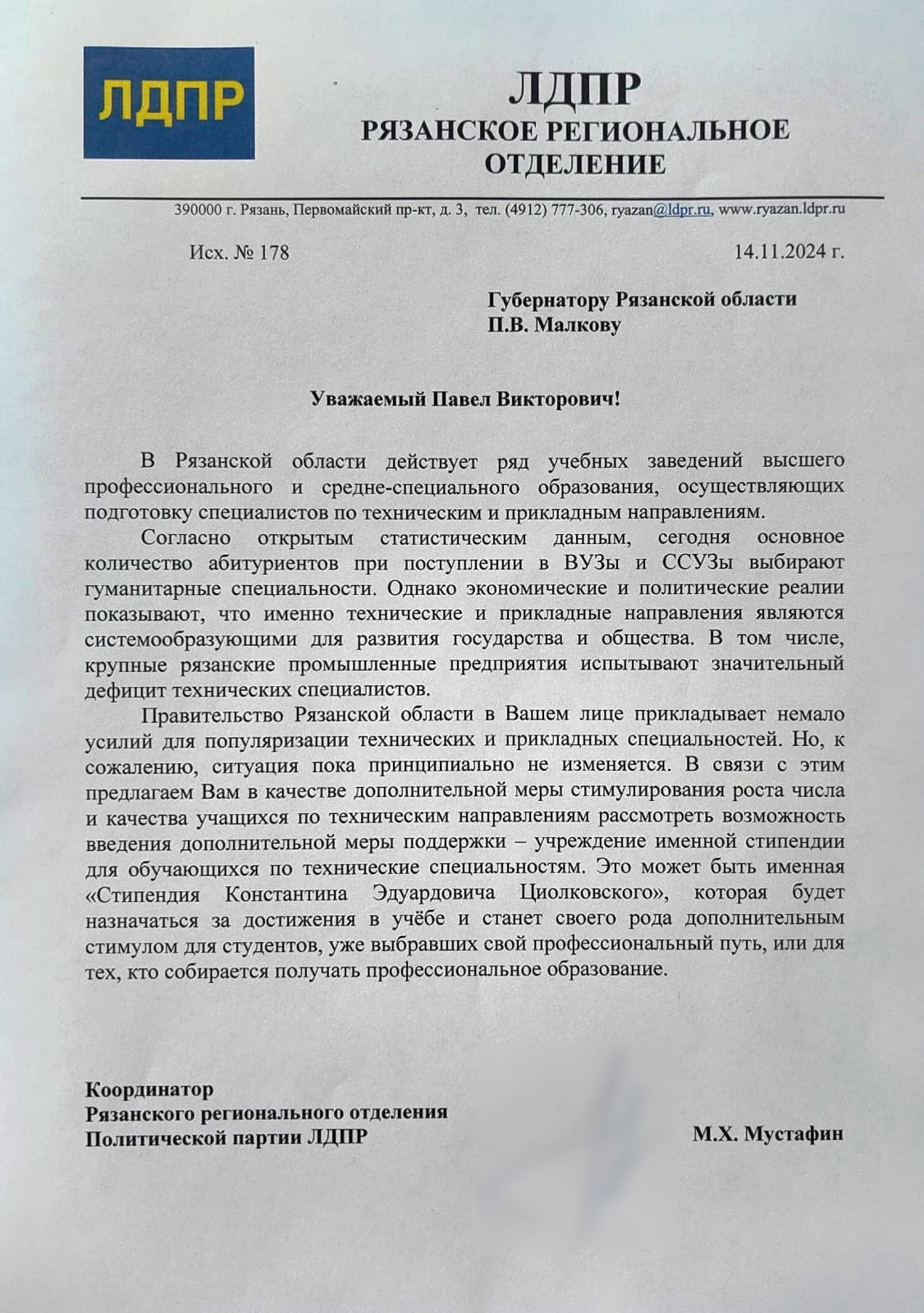 Координатор Рязанского регионального отделения ЛДПР Максим Мустафин направил обращение к главе региона с предложением учредить именную «Стипендию Константина Эдуардовича Циолковского» для обучающихся по техническим специальностям. Правительство области прикладывает немало усилий для популяризации технических и прикладных специальностей. Стипендия имени выдающегося исследователя и крупнейшего учёного в области воздухоплавания, авиации и космонавтики поддержит студентов и станет хорошим стимулом к обучению.