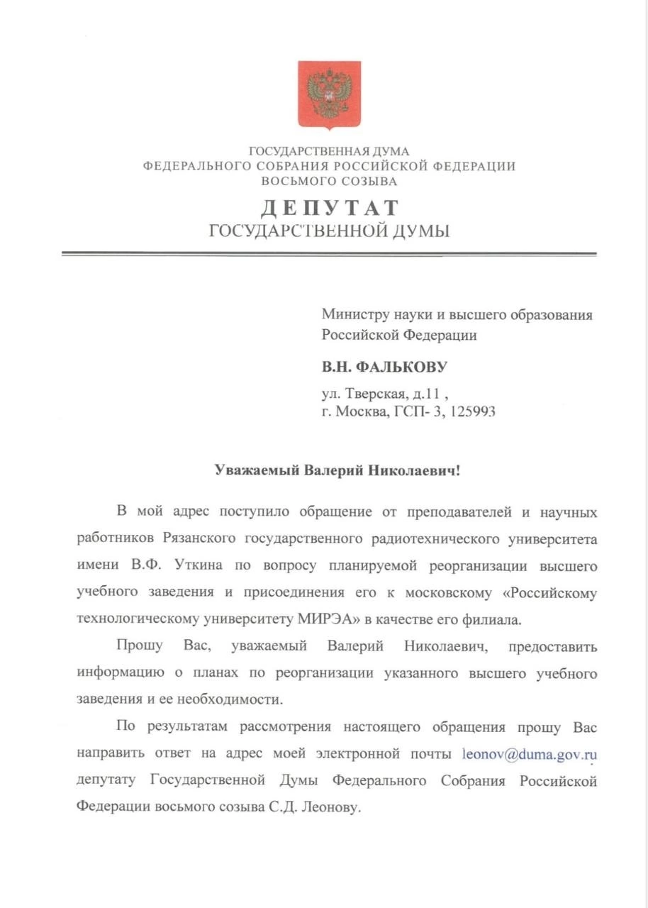 Парламентарий направил обращение Министру науки и высшего образования Валерию Фалькову с просьбой подтвердить или опровергнуть наличие планов по присоединению РГРТУ к МИРЭА. Как отмечает Сергей Леонов, тема взята на личный контроль.